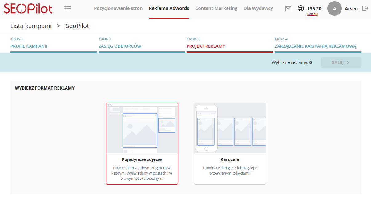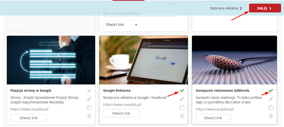 Po wyborze reklam, które chcesz dodać do swojej kampanii (zielona ikona ptaszka) kliknij DALEJ.