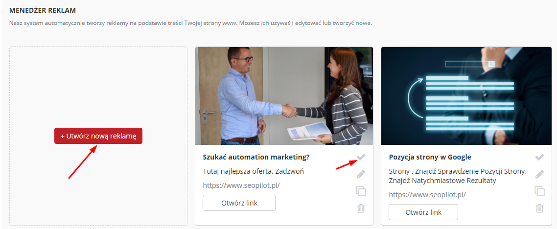 Skorzystaj z gotowych kreacji reklam lub Utwórz nową reklamę.