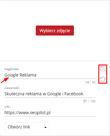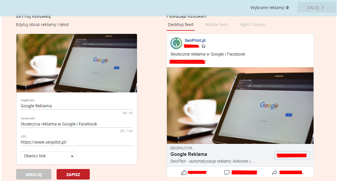 Po kliknięciu w tekst reklamy możesz dokonać szybkiej edycji treści, a następnie je zapisać lub odświeżyć.