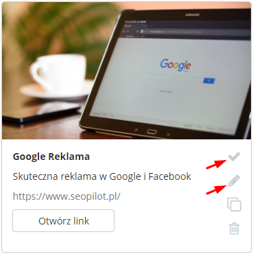 Na tym etapie możesz dodać ogłoszenie do swojej kampanii (ikona ptaszka) lub też dokonać edycji ogłoszenia reklamowego (ikona ołówka).