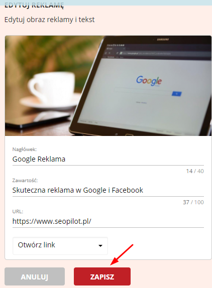 Po naciśnięciu ikony ołówka możesz dokonać edycji ogłoszenia reklamowego na podstawie jego podglądu.