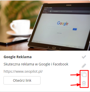 Możesz też skopiować reklamę (ikona kwadratów) lub ją usunąć (ikona kosza).