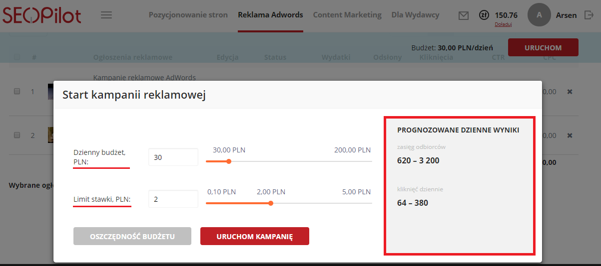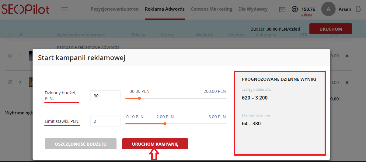 Aby uruchomić kampanię reklamową naciśnij przycisk URUCHOM KAMPANIĘ.