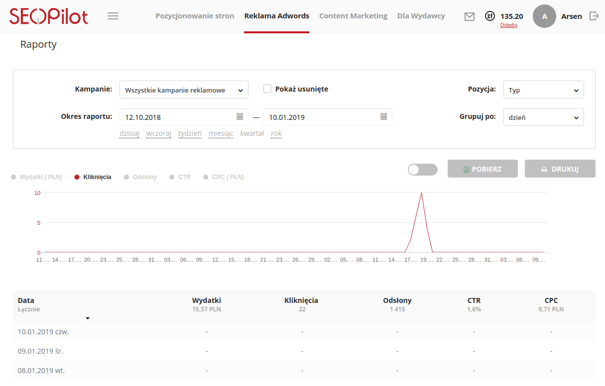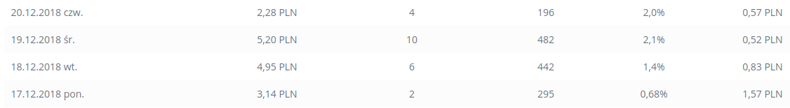 Także w raportach finansowych możemy zobaczyć za dowolnie wybrany okres wydatki, ilość kliknięć, odsłon, CTR ( z ang. click-through rate - współczynnik klikalności wskaźnik klikalności w reklamę w Internecie, oznacza procentowy stosunek liczby kliknięć w reklamę do liczby jej wyświetleń, CTR może być stosowany dla dowolnego hiperłącza dla którego prowadzony jest wykaz liczby wyświetleń i ilości kliknięć, często też, za pomocą wskaźnika CTR sprawdza się efektywność prowadzonej kampanii) i CPC ( z ang. Cost-Per-Click- cena za kliknięcie, koszt jaki ponosi reklamodawca za kliknięcie w reklamę i przejście na jego witrynę.