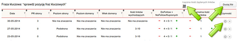 Sumę linków w razie potrzeby możesz bardzo łatwo redagować, a sumaryczna liczba żądanej ilości linków znajduje się nad listą filtrów. Dostępne jest także sortowanie według ogólnych parametrów. Aby dodać nowy filtr, naciśnij przycisk dodaj filtr na górze strony.