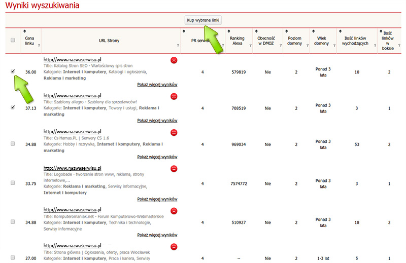Po wybraniu interesujących Cię parametrów i kliknięciu Wyszukaj, otrzymasz listę znalezionych stron Wydawców. Z wyświetlonej listy możesz wybrać najbardziej odpowiadające Ci linki i kupić je. Aby to zrobić, należy zaznaczyć pola obok wybranych linków i kliknąć Zakup, a następnie Zastosuj. Wyniki można uporządkować malejąco lub rosnąco według wybranych kryteriów poprzez kliknięcie na pole z nazwą parametru.