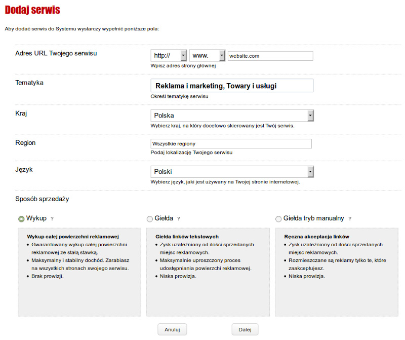 Po rejestracji możesz rozpocząć dodawanie swoich stron internetowych do bazy SeoPilot. Aby tego dokonać, należy podać adres URL serwisu, tematyki oraz kraj, na który docelowo skierowany jest Twój serwis, region (jeśli ma zastosowanie) oraz język, używany na Twojej stronie internetowej. Jeżeli nie jesteś w stanie wskazać żadnego regionu to pozostaw domyślny wybór "Wszystkie regiony".