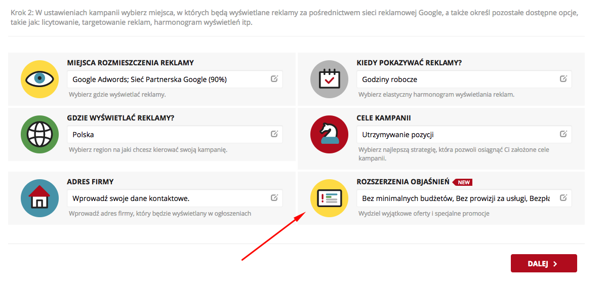 Aby dodać rozszerzenia do wybranej kampanii przejdź do kroku 2 i kliknij w rozszerzenia objaśnień. Dodaj od 2 do 6 objaśnień wybierając gotowe szablony (nasze propozycje) lub tworząc własne teksty. Objaśnienia mogą zwiększyć efektywność reklam tekstowych poprzez promocję unikalnej oferty takiej jak np. 24-godzinna obsługa klienta.