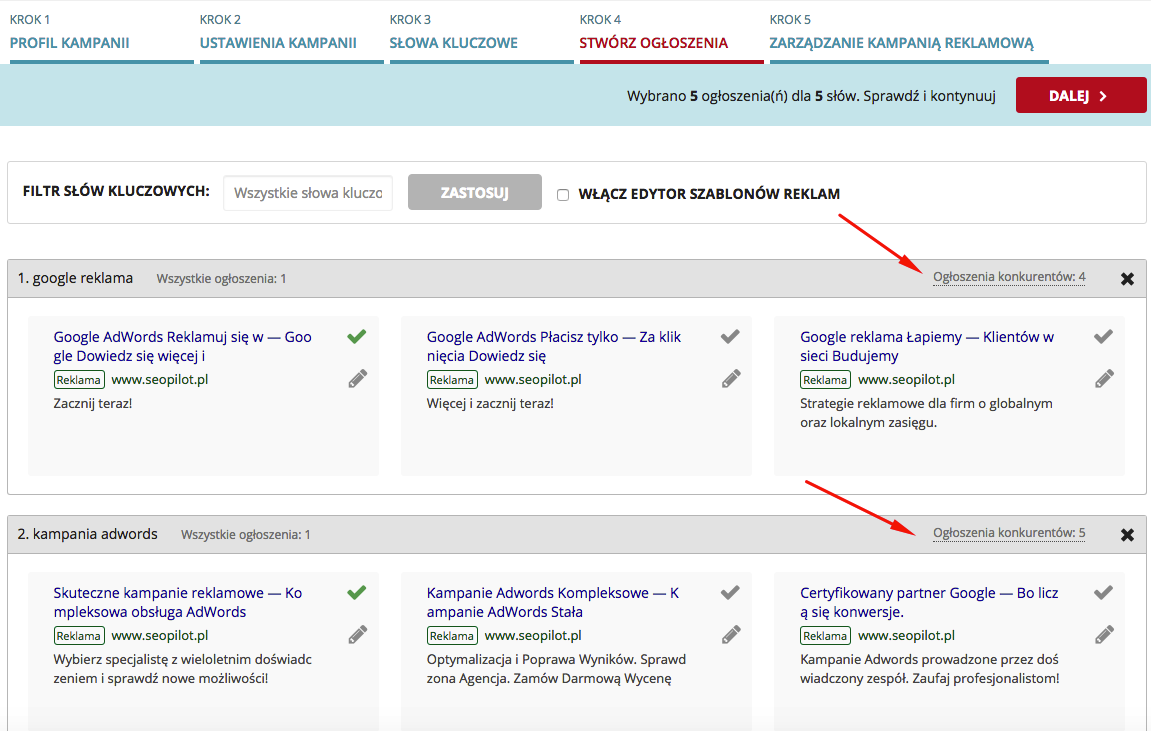Znaleźć je możesz w kroku 4. Dla wybranej frazy kluczowej nasz generator ogłoszeń pokaże Ci ogłoszenia Twoich konkurentów, którzy reklamują się w sieci wyszukiwania. Na potrzeby Twojej kampanii są one nieco zmodyfikowane, więc (w większości wypadków) możesz bez edycji treści wybrać, które ogłoszenia chcesz użyć w swojej kampanii!