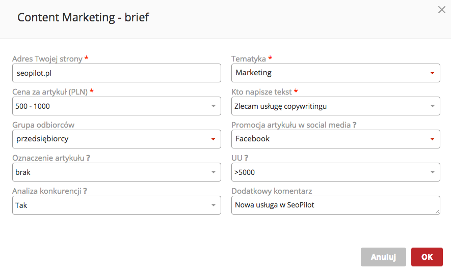 Moduł Content Marketingu działa póki co w wersji beta, ale już niebawem będzie dostępna pełna wersja nowej usługi. Obecnie wypełniając brief nasz specjalista dobierze (zupełnie bezpłatnie) 10 stron wydawców, na których możesz opublikować swój artykuł. Zgodnie z Twoimi wymaganiami.