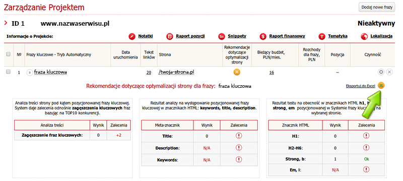 Dzięki temu możesz w wygodny sposób korzystać ze wskazówek dotyczących optymalizacji Twojej strony, które wygeneruje dla Ciebie nasz System Rekomendacji.
