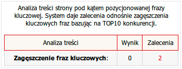Optymalizacja treściJeśli strona jest pozycjonowana na określoną frazę kluczową, powinna ona znajdować się w dosłownej formie w treści na stronie. Frazy niskokonkurencyjne wystarczy wpisać w tekst jeden raz, a te bardziej konkurencyjne - kilka razy. Niemniej nie należy też przesadzać, lecz dążyć do naturalności - teksty “dla ludzi” są zdecydowanie lepiej przyjmowane przez współczesne algorytmy wyszukiwarek, niż te jawnie przepisywane pod wyszukiwarki. Zagęszczenie słów kluczowych można w prosty sposób sprawdzić w systemie Rekomendacji SeoPilot.pl, który obliczy ile na dany moment słów kluczowych znajduje się na stronie, oraz podpowie, jaka ich ilość jest optymalna dla pozycjonowania.