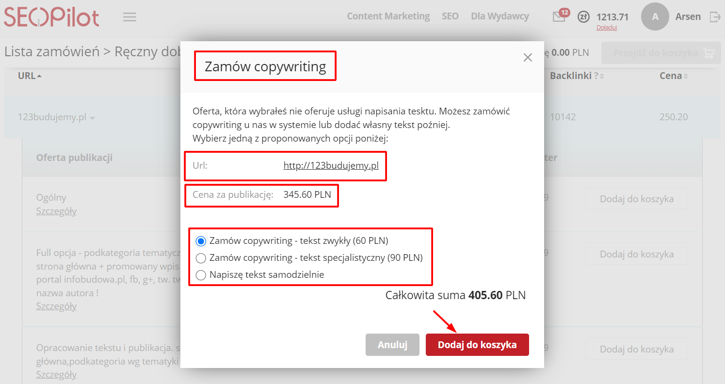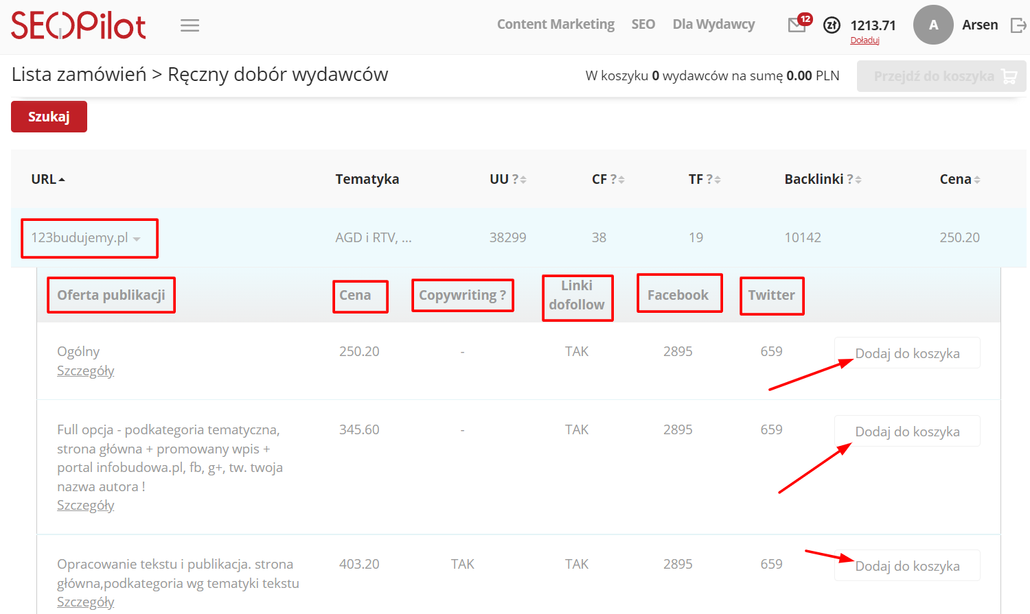 Wybieramy z listy serwis wydawcy klikając na "Dodaj do koszyka", aby opublikować artykół na stronie www danego wydawcy.