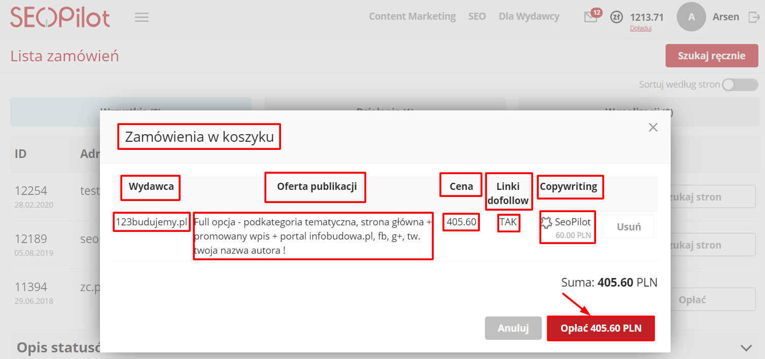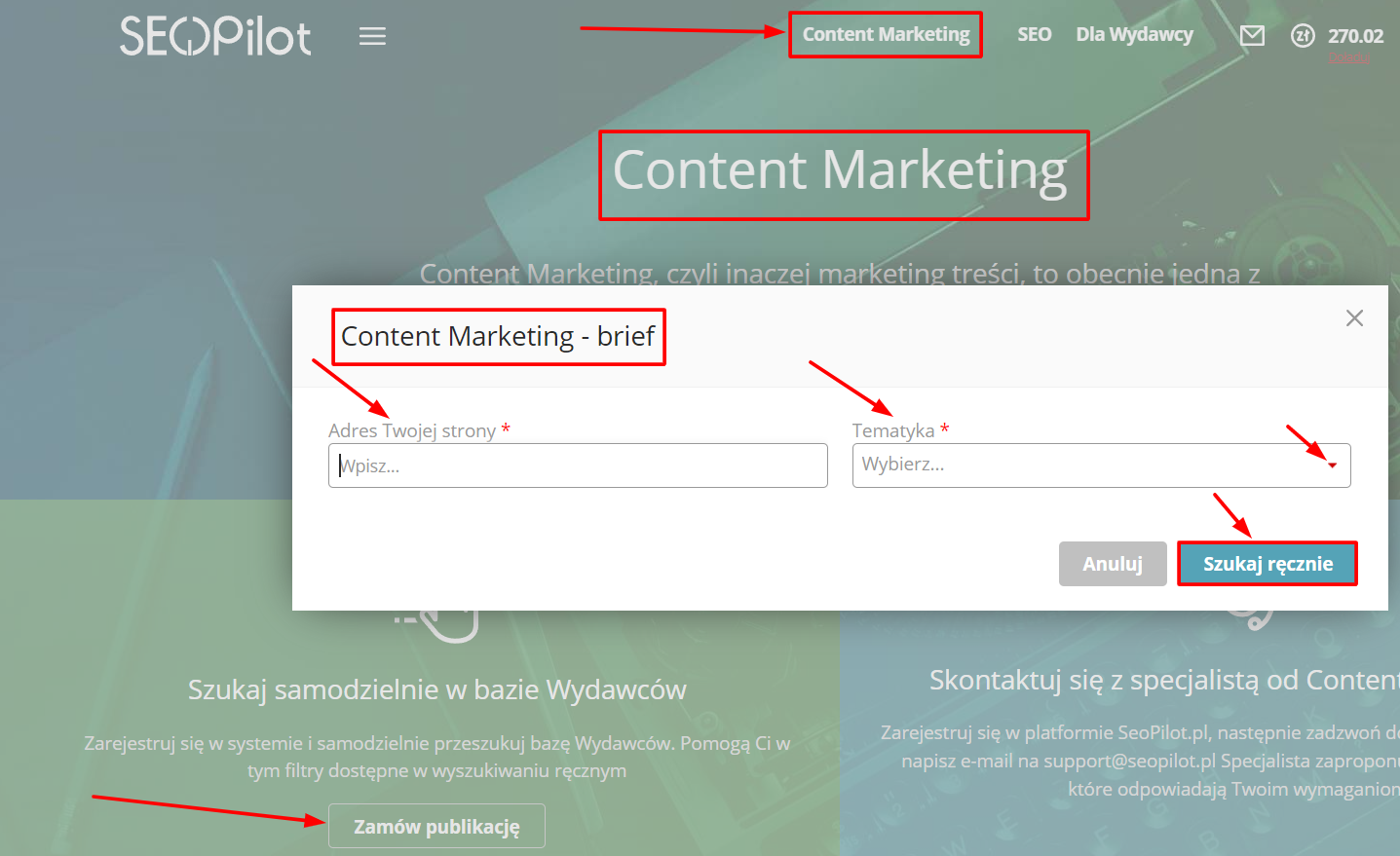 Po zalogowaniu na platformę Seopilot.pl i kliknięciu na "Zamów publikację" na stronie https://www.seopilot.pl/contentmarketing.html wystarczy wpisać