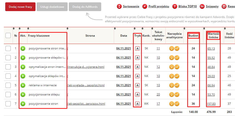 Po wejściu do TOP10 dla frazy zostanie zaproponowany Budżet Systemu równy sumie wartości rozmieszczonych linków. Prosimy jednak pamiętać, że nowy budżet nie przekroczy maksymalnego budżetu, wynoszącego w zależności od konkurencyjności słowa 99, 120 lub 144 zł/mies.