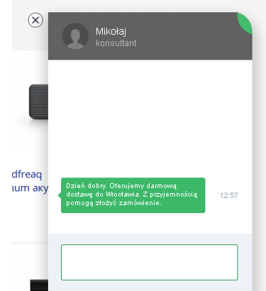 3. Skonfiguruj autoresponder (automatyczną odpowiedź) Istotne jest, aby nie zawieść oczekiwań klienta, który zdecydował się do nas napisać za pomocą czatu. Jeśli nasz pracownik jest w tym momencie zajęty i nie może od razu odpowiedzieć na wiadomość, tekst autorespondera powinien próbować utrzymać użytkownika za pomocą tekstu w rodzaju: “Dziękujemy za zgłoszenie! Nasz konsultant będzie dostępny za kilka minut i z chęcią odpowie na wszelkie pytania”. 4. Jeśli okno dialogowe zostało raz zamknięte - zablokuj jego ponowne otwieranie się w innych miejscach strony. Przykłady konfiguracji konsultanta online Wariant 1 Określ jako warunek otwarcia czatu pewien czas przebywania klienta na docelowej podstronie (na przykład na karcie towaru lub w rozdziale katalogu) - 10, 15, 20 sekund - zależnie od ilości treści. Przez ten czas zdąży on zapoznać się z ofertą i będzie prawdopodobnie gotowy do zadania pytań. Tekst powitania najlepiej dostosować do treści podstrony (rys.2).