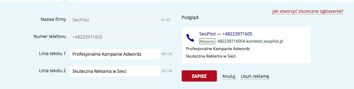 Takie ogłoszenia to, nic innego, jak najszybszy sposób na uzyskanie połączenia z potencjalnym klientem. Skraca on do minimum ilość czynności, które należy wykonać, aby porozmawiać np. z konsultantem danej firmy. Konwersja - pozyskanie nowego klienta - będzie tutaj w dużej mierze zależeć od pracowników, którzy dane połączenia odbierają.