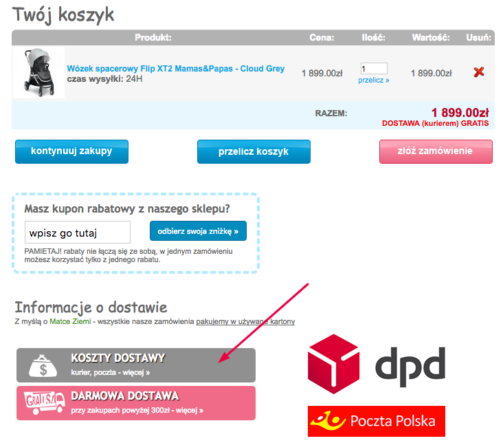 2. Prawidłowe rozmieszczenie i dostępność koszyka.Wszyscy jesteśmy przyzwyczajeni do tego, że koszyk znajduje się w prawym górnym rogu strony. I tam go zazwyczaj szukamy kiedy chcemy coś kupić. Jeśli webmaster umieścili go w innym miejscu, może to zniechęcić potencjalnego klienta do dokonania zakupów. Oto przykład niestandardowego umieszczenia koszyka: ![]() Koszyk został umieszczony z lewej strony, pod menu Użytkownik prawdopodobnie będzie szukał koszyka w prawym górnym rogu, ale tam go nie odnajdzie. Jeśli umieszczasz koszyk w standardowym miejscu, upewnij się, że wyróżnia się od spośród innych opcji. W przedstawionym poniżej rysunku ciężko jest odnaleźć koszyk pośród pozostałych elementów. ![]() Koszyk w danym sklepie zlewa się z innymi elementami menu nawigacyjnego i nie jest umiejscowiony w prawym górnym rogu. Oto przykład prawidłowego położenia koszyka: ![]() Koszyk wyróżnia się od innych elementów, umieszczony jest w prawym górnym rogu. 3. Wezwanie do działania - CTAKoszyk jest narzędziem sprzedaży. Użytkownik, który dodał do niego towar, jest tak samo bliski zakupu jak i opuszczenia strony. Należy o tym pamiętać. 4. Cechy produktuWłaściciele sklepów internetowych znają swój asortyment i bez problemu są w stanie odróżnić od siebie poszczególne towary. Dla klienta liczą się nie tyle nazwy, co dokładna charakterystyka produktu i jego widoczność na każdym etapie zakupu. Każdy chce mieć pewność, że kupuje towar, który potrzebuje. Tak powinien wyglądać opis towaru w koszyku: ![]() Towar w koszyku został dokładnie opisany: podane są jego rozmiary, kolor, dodatkowe wyposażenie. Klient ma pewność, że kupuje to, czego szukał 5. Obraz produktuMogłoby się wydawać, że obraz przedstawiający produkt, to wszystkim dobrze już znany i oczywisty temat. Nawet jeśli sprzedajesz części zapasowe, pamiętaj o umieszczaniu obrazów. Wizualizacja pomaga użytkownikowi w wyborze towaru, sprawia, że jest on bardziej «namacalny» i wzbudza zaufanie. 6. ZawartośćWyobraź sobie sytuację, że ktoś znalazł Twoją stronę, przejrzał ją, wybrał produkty i dodał je do koszyka, a następnie przypadkowo zamknął przeglądarkę,bądź po prostu zdecydował się jeszcze pomyśleć nad zakupem. W takim przypadku ważne jest, by wybrane towary były dostępne, przy ponownej wizycie na stronie. 7. Informacje dotyczące płatności i dostawy.Płatność i dostawa są najważniejszymi kwestiami podczas podejmowania decyzji zakupowych. Według statystyk 37% użytkowników rezygnuje z zakupu, tylko dlatego, że nie zostaje im przedstawiona w odpowiednim czasie informacja dotycząca dostawy. Każdy chce wiedzieć kiedy bуdzie dostarczony towar, a także znać koszt dostawy, z uwzględnieniem opłat dodatkowych. Istnieją różne sposoby informowania o dostawie. Jeden z nich prezentujemy poniżej: ![]() W tym przypadku przedstawione zostały ogólne warunki dostawy. Darmowa dostawa dla zakupów powyżej 300 zł, możliwość wyboru firmy kurierskiej i obliczenia kosztów. Na niektórych stronach przedstawiona jest ostateczna cena zakupów z uwzględnieniem wszystkich kosztów. Zazwyczaj umieszczona jest linia, wyraźnie oddzielająca wartość zakupu od kosztów dodatkowych. Jest to dobry sposób ponieważ nie pozostawia wątpliwości w omawianej przez nas kwestii. Z drugiej strony, jeśli pracujesz z różnymi firmami kurierskimi, to obliczenie dokładnego kosztu nie zawsze jest możliwe. Dlatego trzeba uwzględniać sytuację i wybrać sposób, który nie wprowadza klientów w błąd. 8. Brak działań dodatkowych.Nie zmuszaj użytkownika do wykonywania większej ilości działań niż wymaga tego złożenie zamówienia. Niektóre sklepy uniemożliwiają bezpośrednie dodanie produktu do koszyka. Aby to zrobić w pierwszej kolejności trzeba przejść do opisania towaru, a dopiero potem kliknąć przycisk „Kup”. Taki system sprawdzi się jedynie w sytuacjach, gdy trzeba wybrać parametry zakupu, takie jak rozmiar, waga, opakowanie itd. W innych przypadkach jest po prostu niewygodny. 9. Produkty pokrewne.Z pomocą koszyka można istotnie zwiększyć sprzedaż towarów dodatkowych, takich jak np. akcesoria. Użytkownik kupuje odtwarzacz? Zaproponuj mu słuchawki! Telewizor? Zaoferuj mocowania lub podstawę. Laptop? Zaproponuj usługę dodatkowej obsługi klienta lub zestaw do czyszczenia ekranu. Jest mnóstwo wariantów. Upsell działa poprawnie w karcie artykułu, użyteczny będzie również na etapie koszyka. ![]() Zastosowanie upsell - proponowanie dodatkowych towarów, akcesoriów do zakupionego towaru. W rezultacie, zarówno Ty jak i klient jesteście na wygranej pozycji. Mógł on bowiem zapomnieć o pewnych dodatkach do wybranego produktu, czy też nawet nie wiedzieć o ich istnieniu. Dobrym sposobem będzie oferowanie podobnych towarów w zestawach i sprzedawanie ich ze zniżką. ![]() Przykład zastosowania sprzedaży zestawami 10. Zrozumiałe oznaczeniaLudzie przyzwyczajają się do ogólno przyjętych oznaczeń. Wszyscy wiemy, że w Internecie, omawiana przez nas funkcja, jest zazwyczaj przedstawiona za pomocą obrazu koszyka, wózka używanego w supermarkecie. Wszelkie inne obrazki mogą wprowadzać w błąd. 11. Szybki zakup.Nie każdy chce rejestrować się na stronie, wypełniać formularze, wpisywać capche itd. Według niektórych badań, 28% użytkowników rezygnuje z zakupów właśnie z powodu obowiązkowej rejestracji w serwisie. Nie warto zmuszać użytkowników do rejestracji w systemie przed dokonaniem zakupu. W większości przypadków nie jest to konieczne. Pozwól użytkownikowi samemu dokonać wyboru czy chce posiadać konto w Twoim serwisie. ![]() Przykład zakupów bez rejestracji Jeśli proponujesz rejestrację, wyjaśnij dlaczego jest ona potrzebna. Na przykład aby uczestniczyć w programie bonusowym, aby otrzymywać informacje o promocjach, kodach promocyjnych itd. 12. «Nie» d