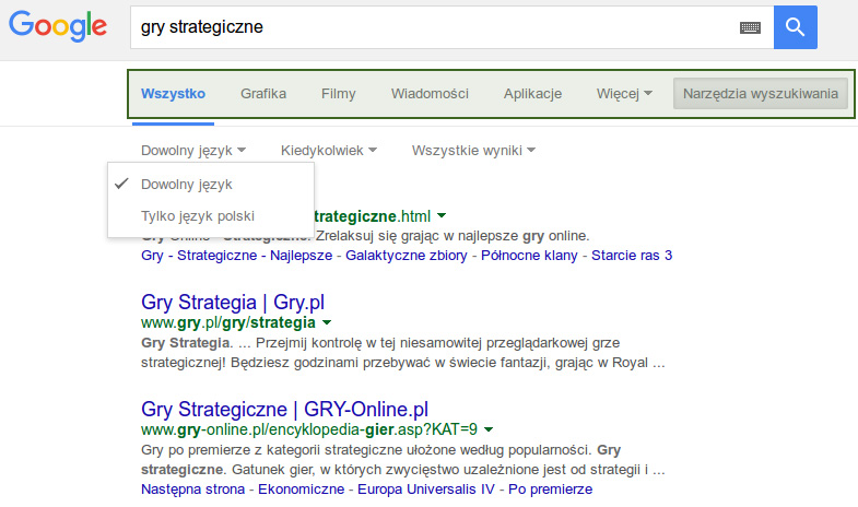 W ostatnich miesiącach pojawiła się dodatkowa opcja flights/loty, co można uznać za próbę przejęcia części rynku sprzedaży biletów lotniczych online (do tego sprowadza się ta funkcjonalność). Dla realnego wyszukiwania jej znaczenie jest minimalne. Ten zestaw opcji jest niezmienny dla wszystkich fraz kluczowych i zawsze można przełączać się między nimi. Z kolei po naciśnięciu przycisku “instrumenty wyszukiwania” zobaczycie szereg opcji, dzięki którym uściślicie parametry wyszukiwania. Jest ona zmienna dla różnych typów wyszukiwania - co logiczne, inne filtry są przydatne przy wyszukiwaniu zdjęć, a inne - przy szukaniu nowości. W przypadku wyszukiwania wśród wszystkich rezultatów, możliwe jest zawężenie: